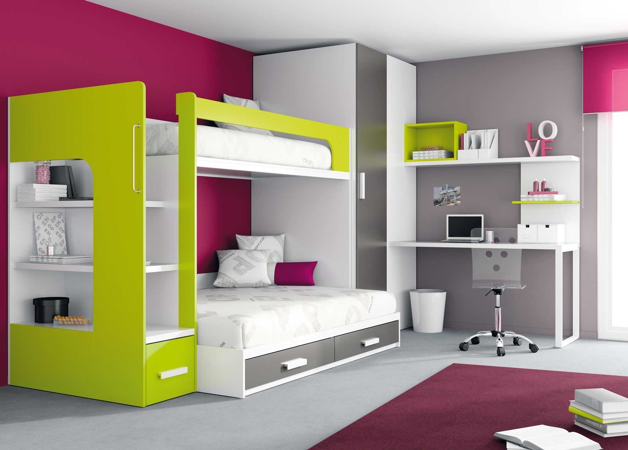 Это позволяет выделять меньше площади для спальных мест, оставив немного свободного пространства для учебы, активного отдыха или другой активности. Интересное решение – кровать под потолком и отдельная кровать. Это выглядит современно, позволяя обеспечить для каждого свободное место. Можно визуально распределить пространство с помощью ширм или перегородок.
