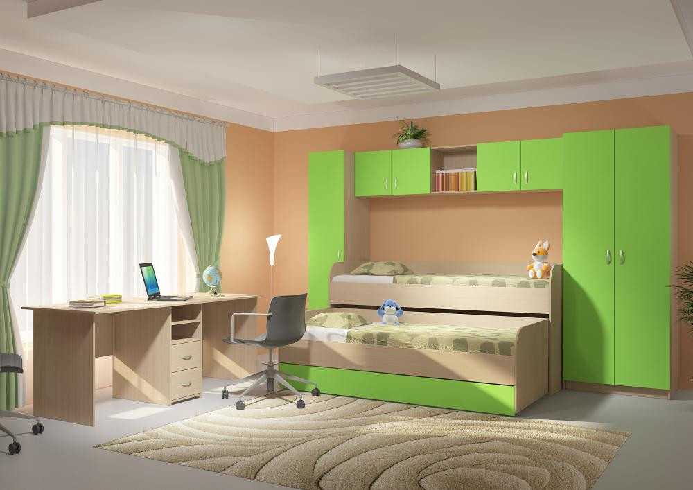 Модульная мебель наиболее практична, так как есть возможность изменять внешний вид и габариты конструкций, создавать различные зоны. Она позволяет выделить для каждого ребенка отдельное пространство для сна, выполнения уроков. Недостаток таких изделий – однотипность. Мебель-трансформер также удобна для использования в комнате двух детей. Так, например, кровать может быть оснащена столом и зоной отдыха, что позволяет сэкономить на приобретении отдельных элементов. Минусы многофункциональных конструкций: высокая стоимость, большие размеры.