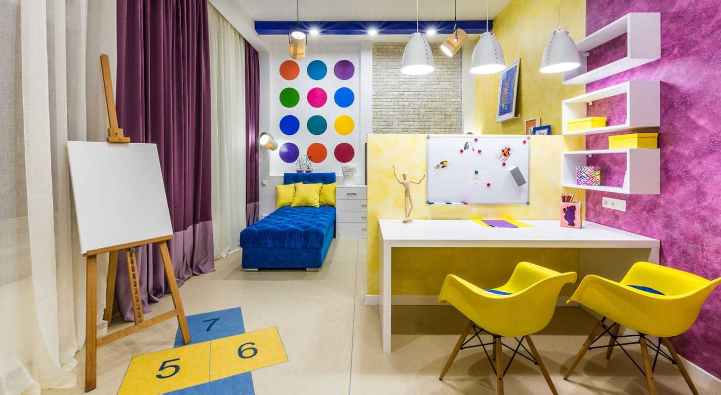 Независимо от пола обитателей детской комнаты зона игр и досуга должна быть обустроена с преобладанием ярких насыщенных красок.