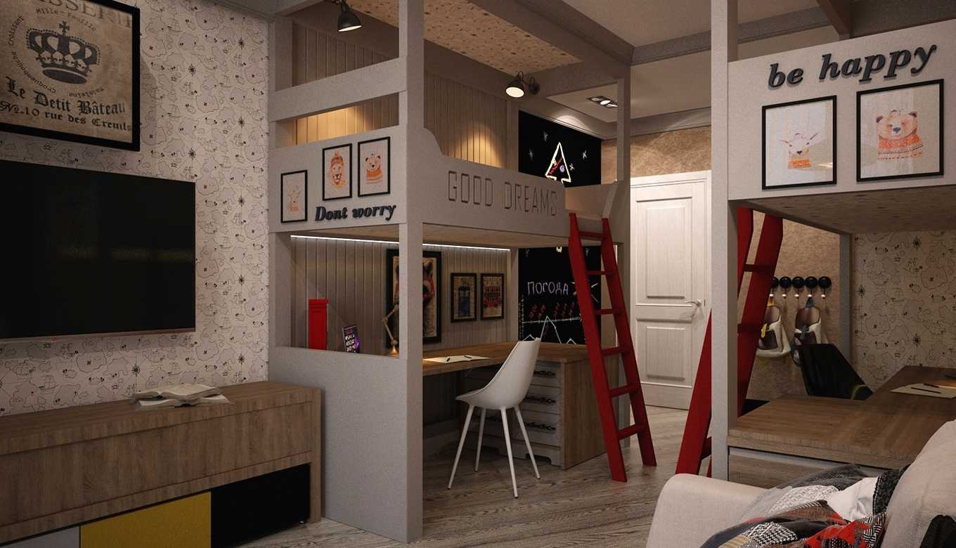 Если комната оформляется для двух мальчишек приблизительно одного возраста, здесь стоит продумать спортивный уголок со шведской стенкой или турником, место для игр, творческую зону. У каждого ребенка должен быть свой письменный стол для занятий и две кровати. Кровати можно сделать одинаковыми и разделенными прикроватными тумбочками. Либо же, можно остановить выбор на двухъярусной кровати, при условии, что комната не более 12 кв. м.