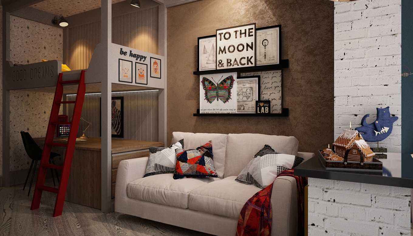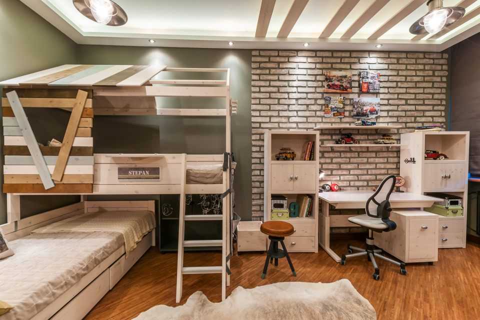 В стилистике лофт часто присутствует создание второго этажа или полуэтажа. Что-бы соответствовать стилю, можно использовать детскую мебель в стиле лофт для мальчиков — двухъярусную кровать, где в нижнем ярусе оборудовано рабочее место.