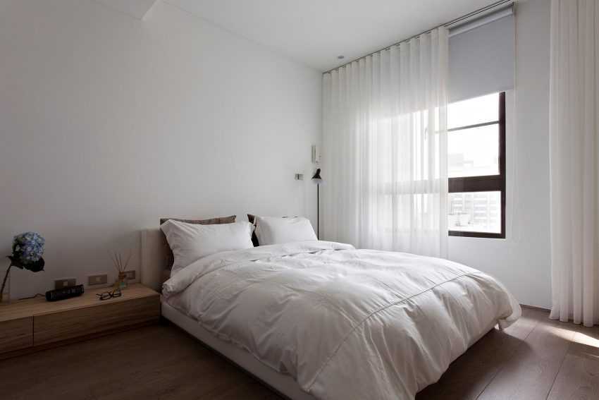 Стиль минимализма в маленькой спальне в контрастных темных и светлых оттенках