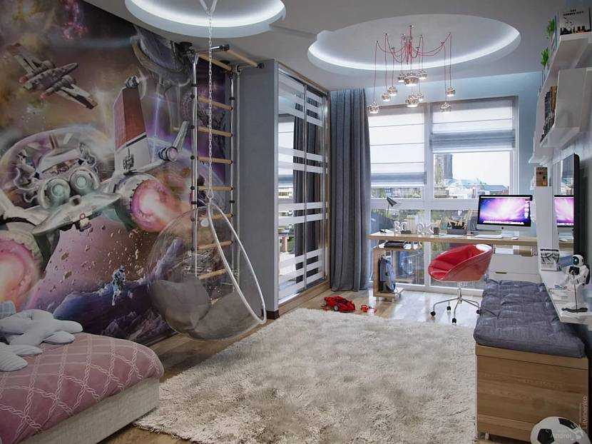 Современный подход к обустройству интерьера детской комнаты для девочки и мальчика позволит использовать все пространство по максимуму, задействовав его как по горизонтали, так и по высоте.