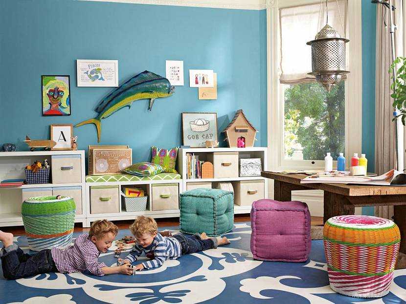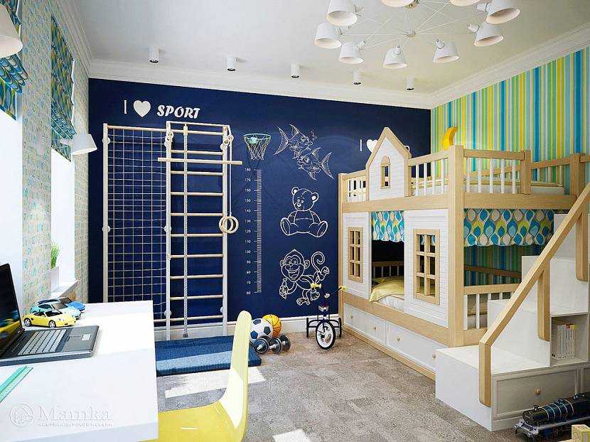 Дизайн детской комнаты в отличие от взрослой позволяет использовать более яркие тона. Мальчишескими цветами обычно считаются разные оттенки синего, зеленого, серого, коричневого и голубого