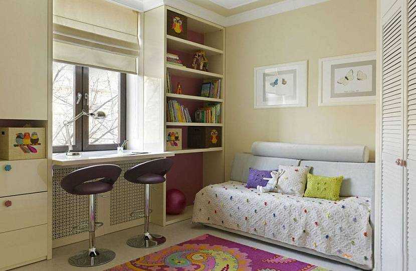 В дизайн детской комнаты 12 обязательно включают зонирование. Маленькую спальню можно разделить при помощи выдвижной софы, служащей спальным местом. В изголовье обустроить навесные шкафы, выдвижные или стационарные полки, а также боковую мини-перегородку. В углу у окна письменный стол. Напротив него – шкаф для вещей.