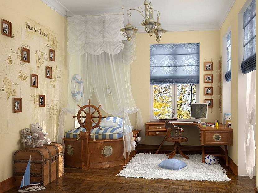 Для мальчика постарше можно подготовить и интерьер построже. Здесь уже может стоять диван, который будет выглядеть массивнее кровати. Вместо занавесок используют жалюзи. Обязательно наличие шкафа, письменного стола, книжных полок, стула-кресла на роликовых опорах. Декорировать можно все любыми тематическими картинками.