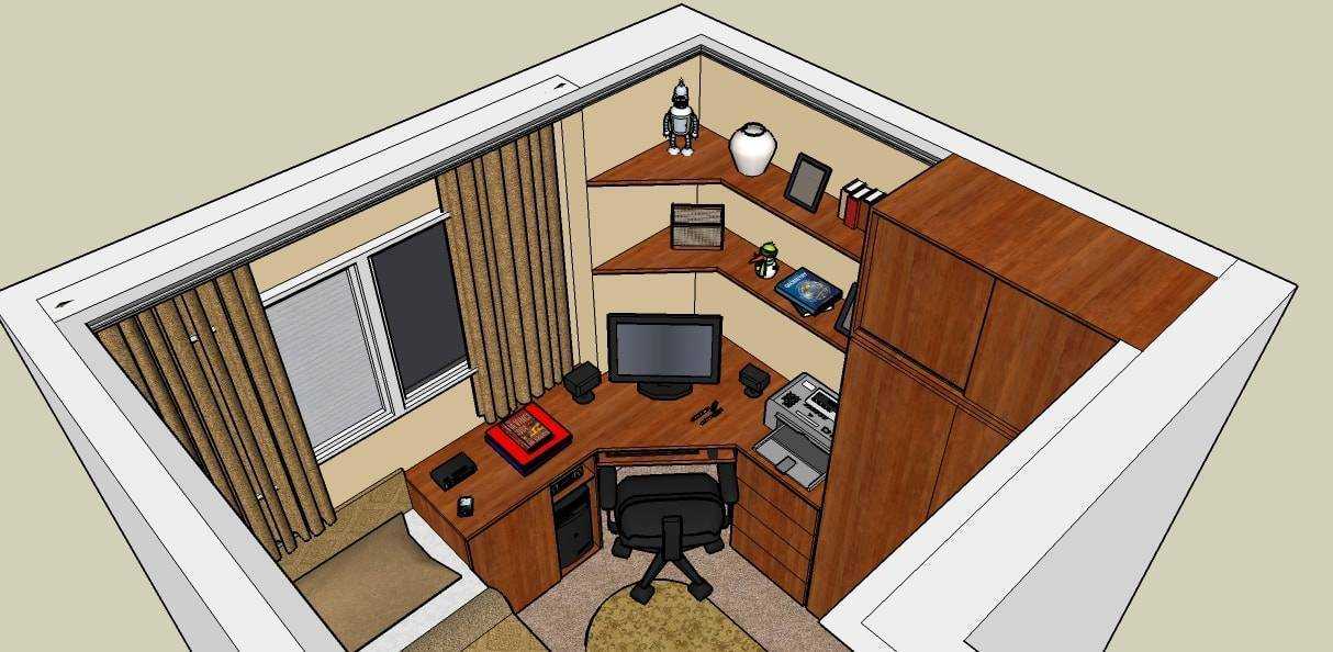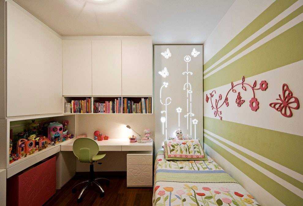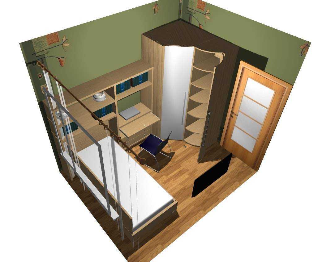 Шкаф и спальное место располагаются вдоль стены, подальше от окна. Рабочее место – у окна. Так доступ дневного света будет максимальным. Свободного места достаточно для игр.