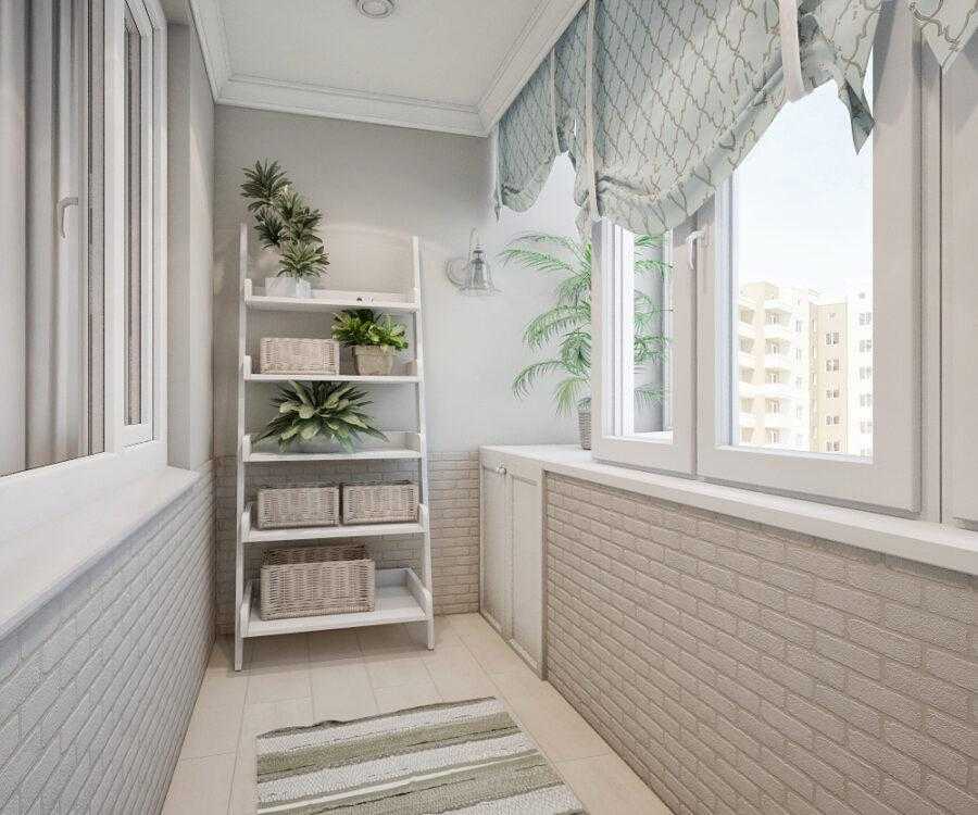 Если есть необходимость в хранении вещей, на торцах лоджии желательно оборудовать шкафы или стеллажи. При недостатке места используют угловые полки. Даже в дизайне балкона 3 кв.м. можно позволить себе сделать две полки вместо шкафа.