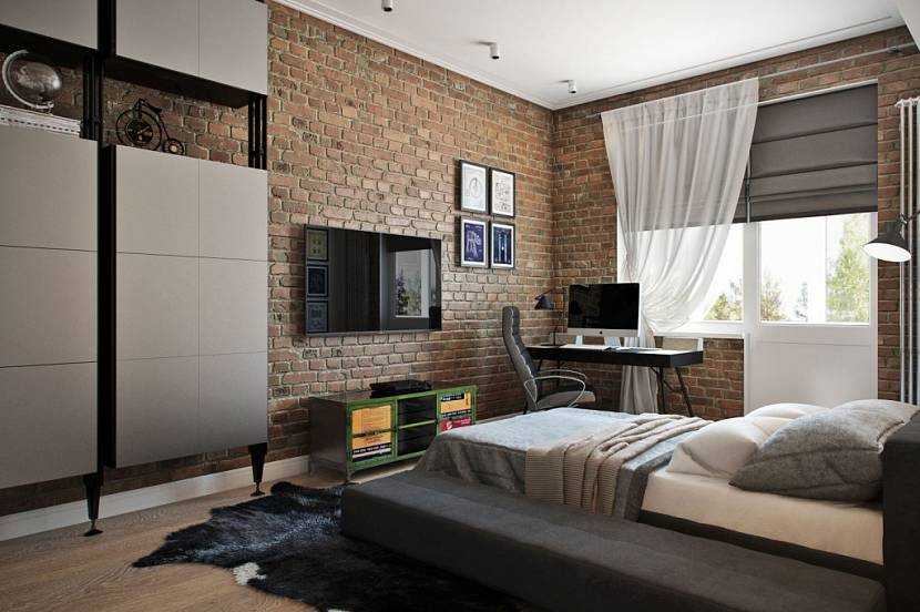 Это идеальное решение для поклонников спорта, авто и мото, а также ценителей брутальности. Для такой комнаты характерно преобладание коричневого в сочетании с кремовым, бежевым оттенком. Стены отделываются кирпичом или обоями, рисунок которых имитирует каменную кладку. В интерьер прекрасно впишется однотонная мягкая мебель и современная техника. Уместно будут смотреться светлые занавески, темные покрывала. Используемые материалы для напольного покрытия – ламинат, плитка, ковролин.