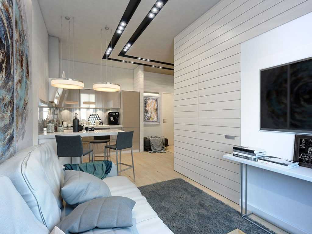 Это главная задача создания дизайна интерьера площадью 30 квадратных метров — обеспечить ее должным образом и обыграть функциональные зоны.