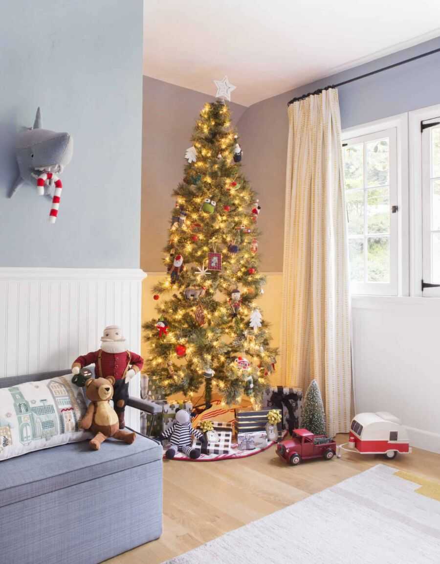 - Внедрение полос в интерьер помогает зрительно вытянуть потолок и расширить стены. В детской к линиям можно подойти с фантазией, например, нанеся на стены рисунок в виде деревьев, стволы которого сделают потолок визуально более высоким.