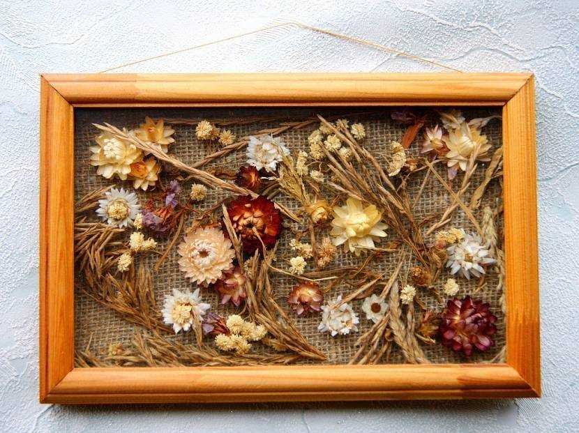 На стене можно сделать панно, которое будет напоминать о лете, тепле. Используют сухие листья кукурузы, деревьев, высушенные цветы, камушки, крупы, бобы, кофейные зерна.