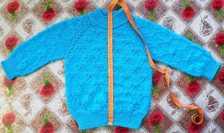 - Продолжаем вязать, делая в лицевых рядах прибавки по одной петле до и после регланов. Таким способом нужно вязать до тех пор, пока получившаяся верхняя часть изделия не будет доходить до линии подмышек ребенка (можно измерить по любой кофточке или по ребенку).