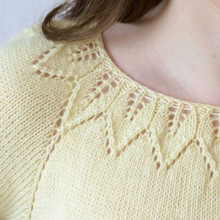 Со следующего ряда начинаем формировать горловину, делаем это так: вяжем кромочную петлю, две петли ряда, а следующие две провязываем как одну лицевую. Повторяем эту процедуру на пятом, седьмом, девятом, одиннадцатом рядах.