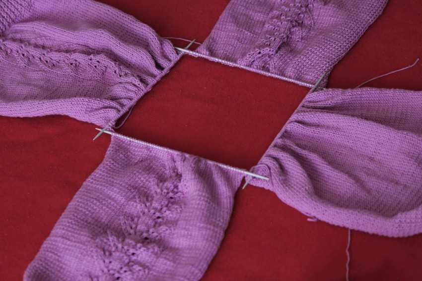 Переводим П рукавов на другие спицы или вспомогательные нити, и продолжаем дальше вязать изделие.