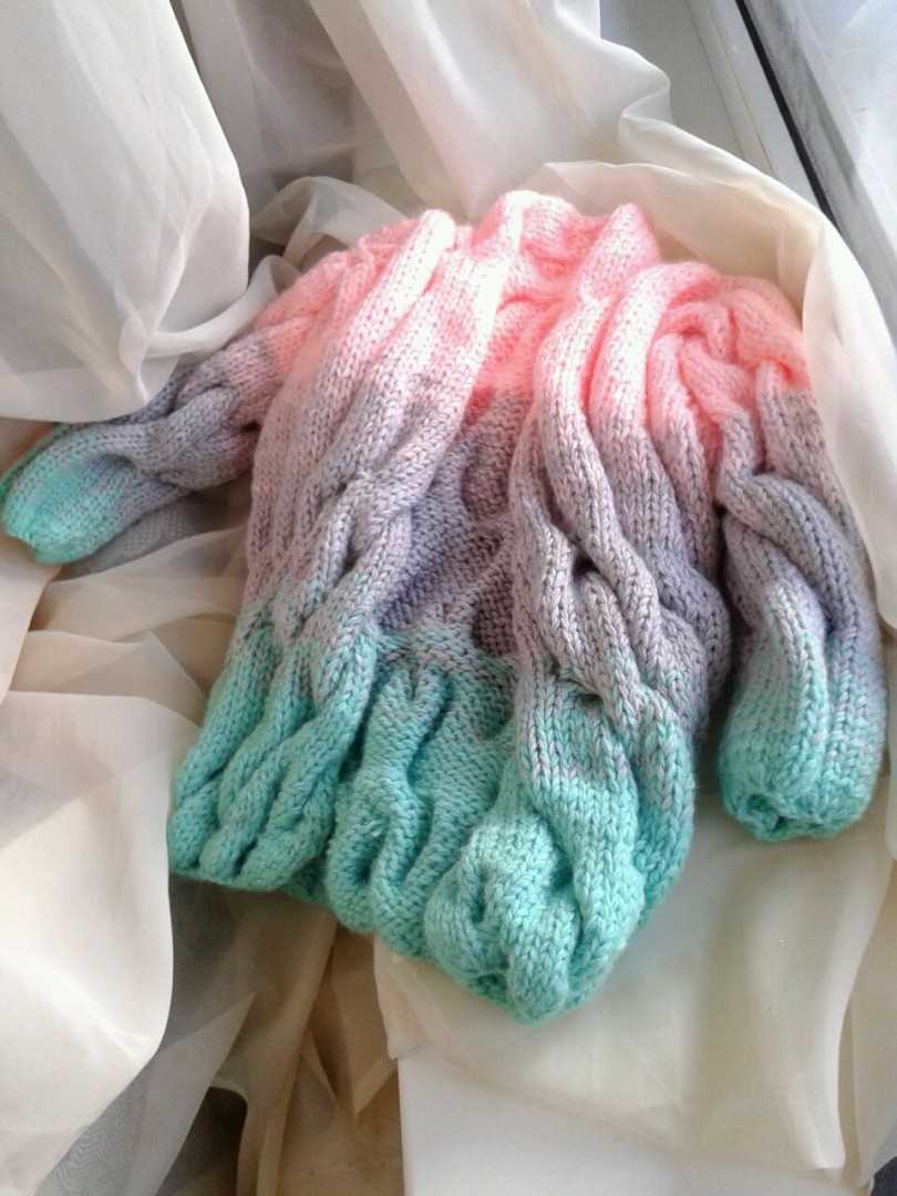 Рукава. Начинаем вязание с резинки 2х2, далее переходите на лицевую гладь. Провязав три-четыре сантиметра, начинайте делать прибавления по одной П в каждом нечетном ряду. Для этого из кромочной П, вывязывайте две (одну за переднюю стенку, другую за заднюю). Полотно должно увеличиться примерно в два раза. Связав нужную длину, закройте полотно. Второй вяжется идентично. Сложите каждую деталь пополам и сшейте иглой или при помощи крючка.