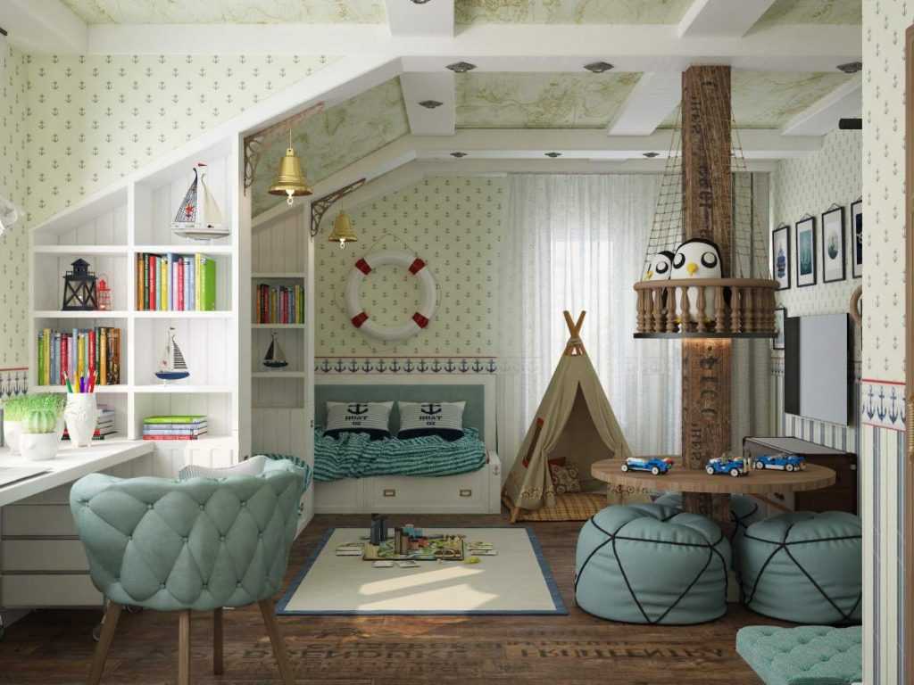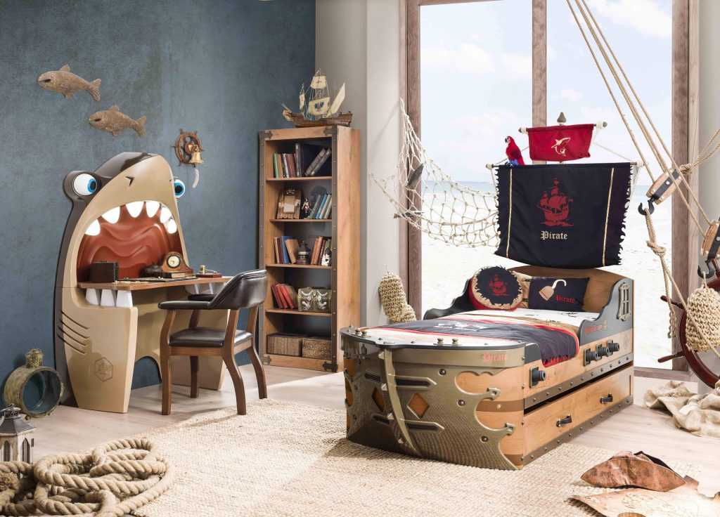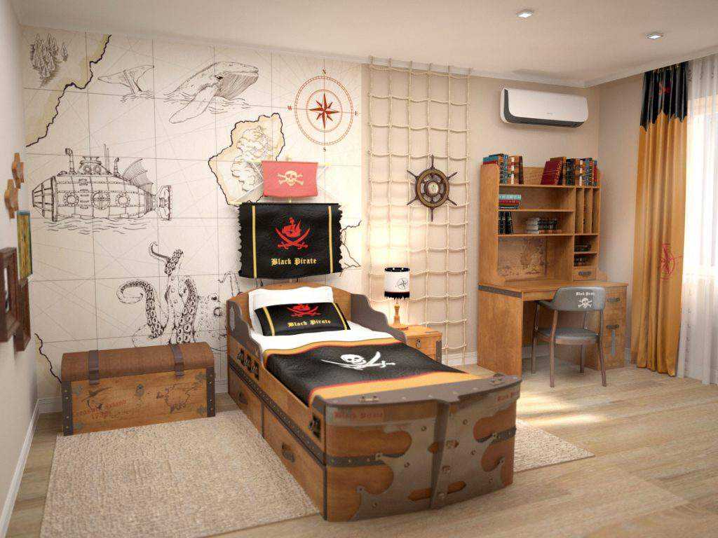 Например, в пиратской комнате можно установить кровать в форме корабля, повесить канаты, на стены пиратские флаги, а в игровой зоне установить штурвал корабля.