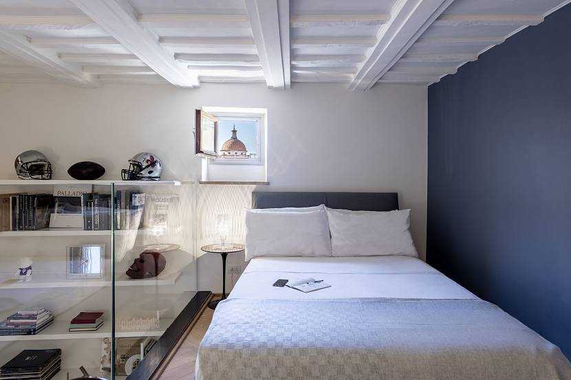 Спальня с кроватью у стены и с широкими полками для мелочей интерьераИсточник www.archilovers.com
