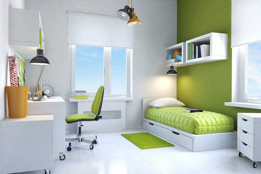Если братья заметно различаются по возрасту, то комната для двух мальчиков с помощью цвета делится на зоны: две стены становятся собственностью одного сына, две другие – второго. Одну зону, к примеру, для старшего сына – студента, оформляют в песочной цветовой гамме с ярко-синими акцентами, а зону младшего ребенка делают белой с зелеными акцентами.