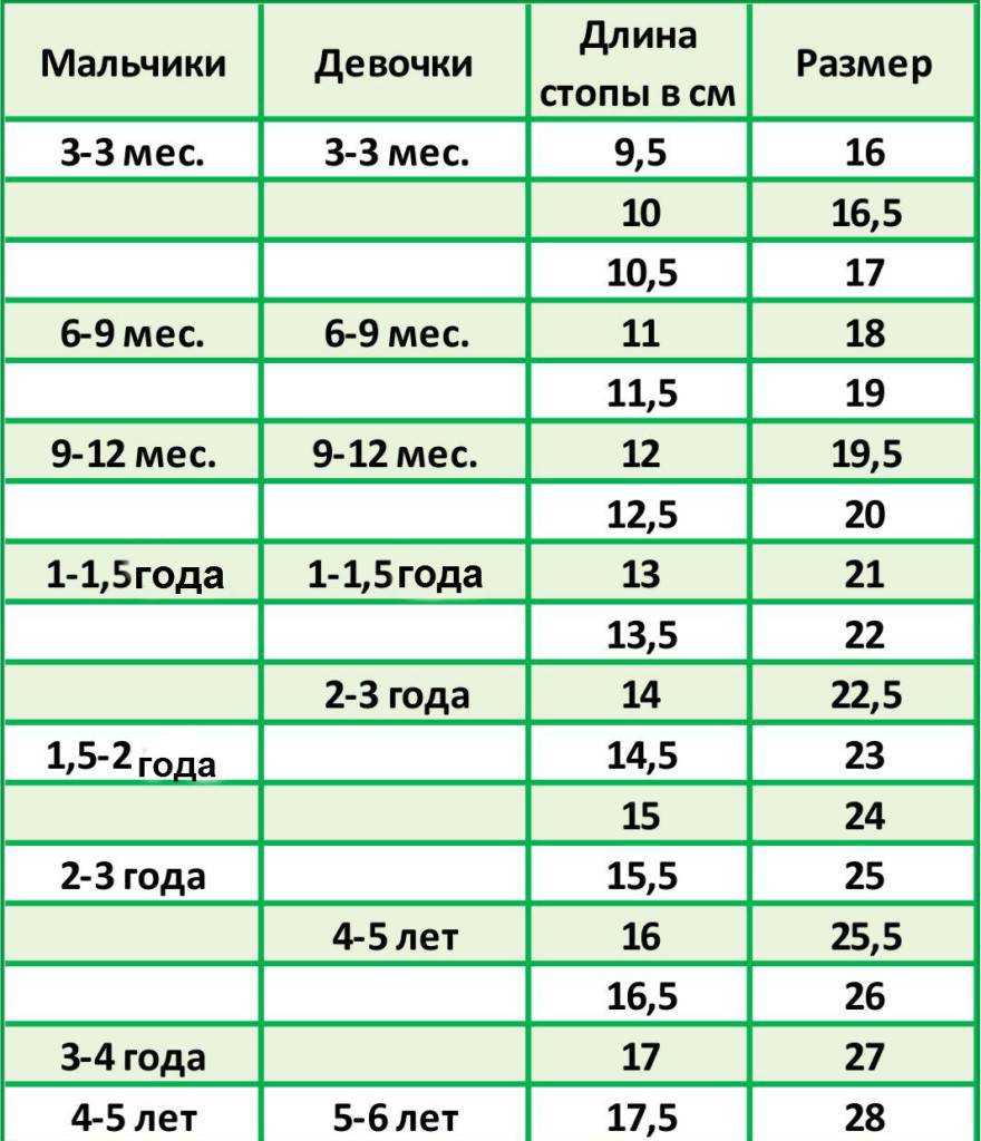 Нога крохи может расти неравномерно, поэтому рекомендуется следить за тем, какой размер ноги ребенка по возрасту. От момента рождения до одного года и от года до трех, величину следует измерять не чаще, чем раз в три месяца. За это время параметры ступни изменяются. В возрасте от трех лет до шести необходимо замерять уже немного реже – раз в четыре месяца. А что касается мальчиков и девочек от шести до десяти лет, то их ногу следует измерять раз в пять месяцев. Данная подсказка поможет вам следить за ростом ноги вашего ребенка и выбрать подходящую обувь.