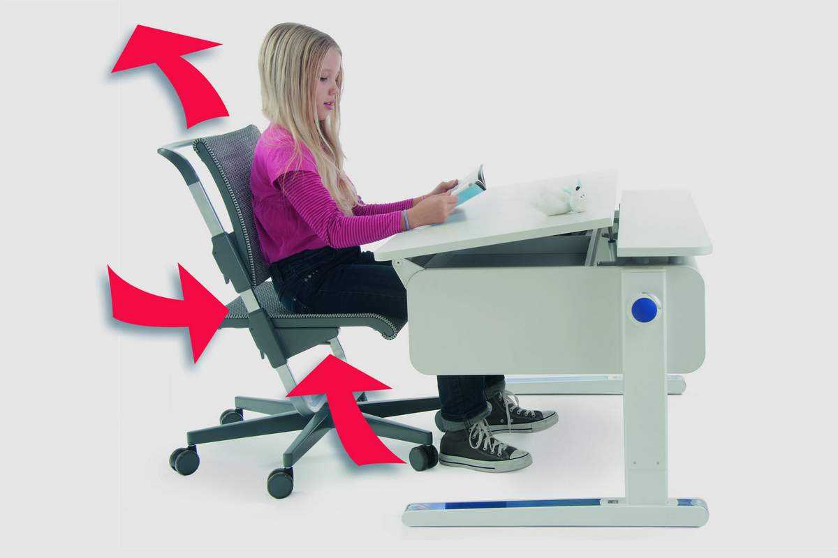 Обязательно должны быть оснащены подставкой для ног в целях профилактики плоскостопия, как говорилось ранее. Кроме того, высота спинки обязательно должна регулироваться, так же как сама сидушка.