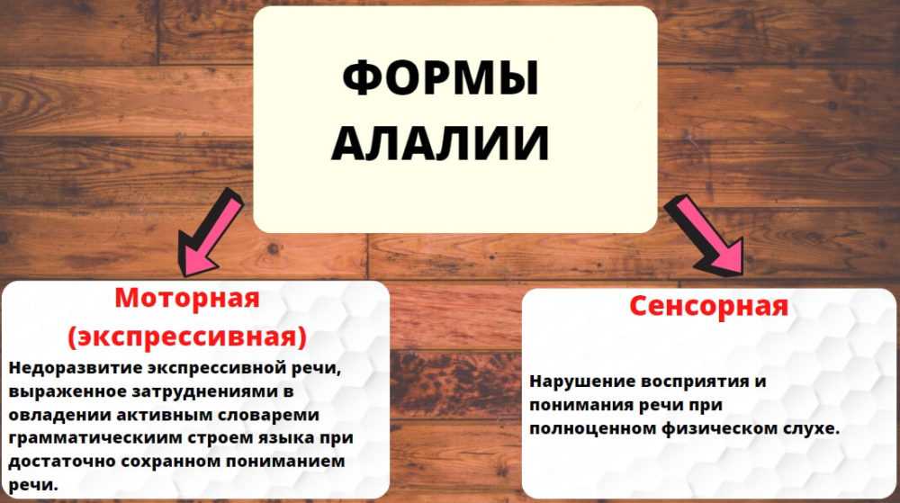 Логопеды выделяют импрессивное (сенсорное) нарушение, когда ребенок затрудняется воспринимать речь, но способен бессвязно и искаженно говорить. Существует экспрессивная алалия (моторная), когда есть понимание услышанного, но самостоятельное произношение невозможно. Помимо сенсорной и моторной форм, выделяют сенсомоторную (смешанную), характеризующуюся наиболее сложным течением.