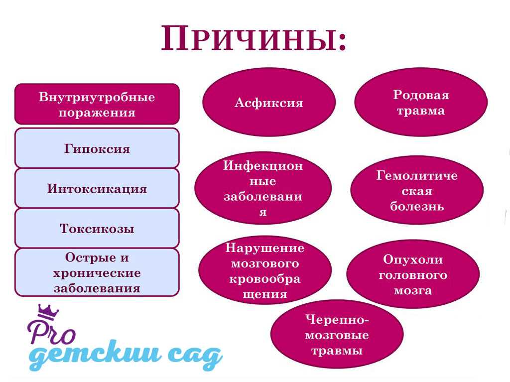 К ним относят: асфиксии, родовые травмы, гемолитическая болезнь, инфекционные заболевания, черепно-мозговые травмы, нарушения мозгового кровообращения, опухоли головного мозга.