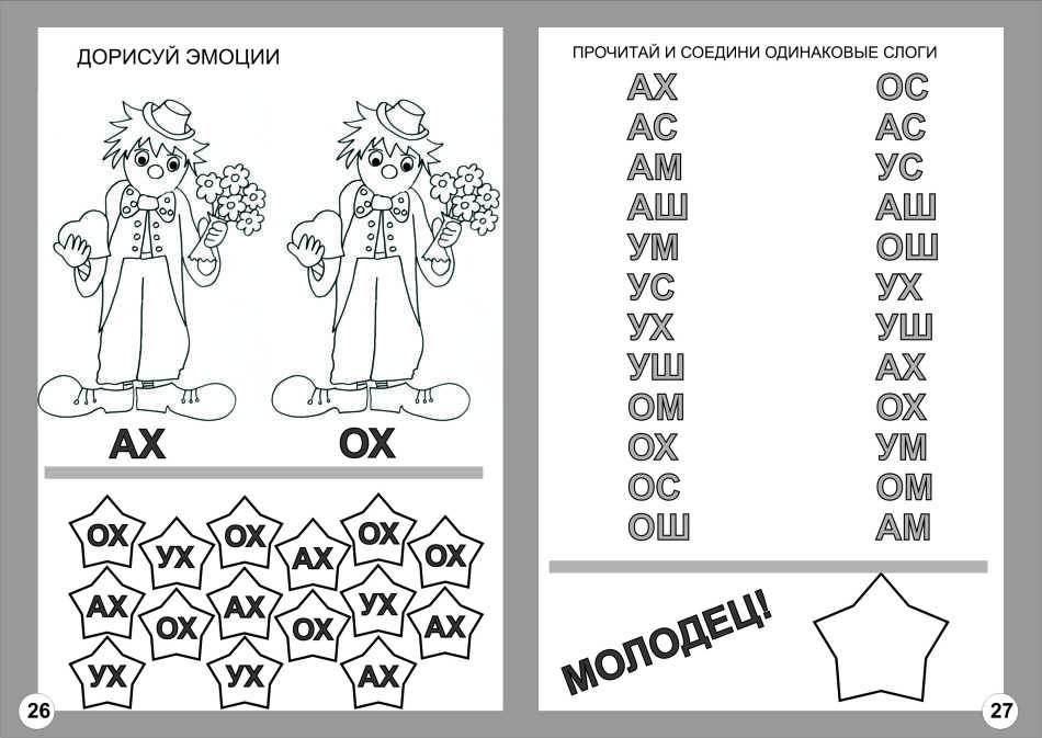 - Слияние звуков. Ребенок не может прочитать слог слитно, выговаривает буквы отдельно. Есть простой визуальный способ: нарисуйте линию между двумя буковками и скажите, что они как бы стремятся друг к дружке. Повторите, отработайте звучание.