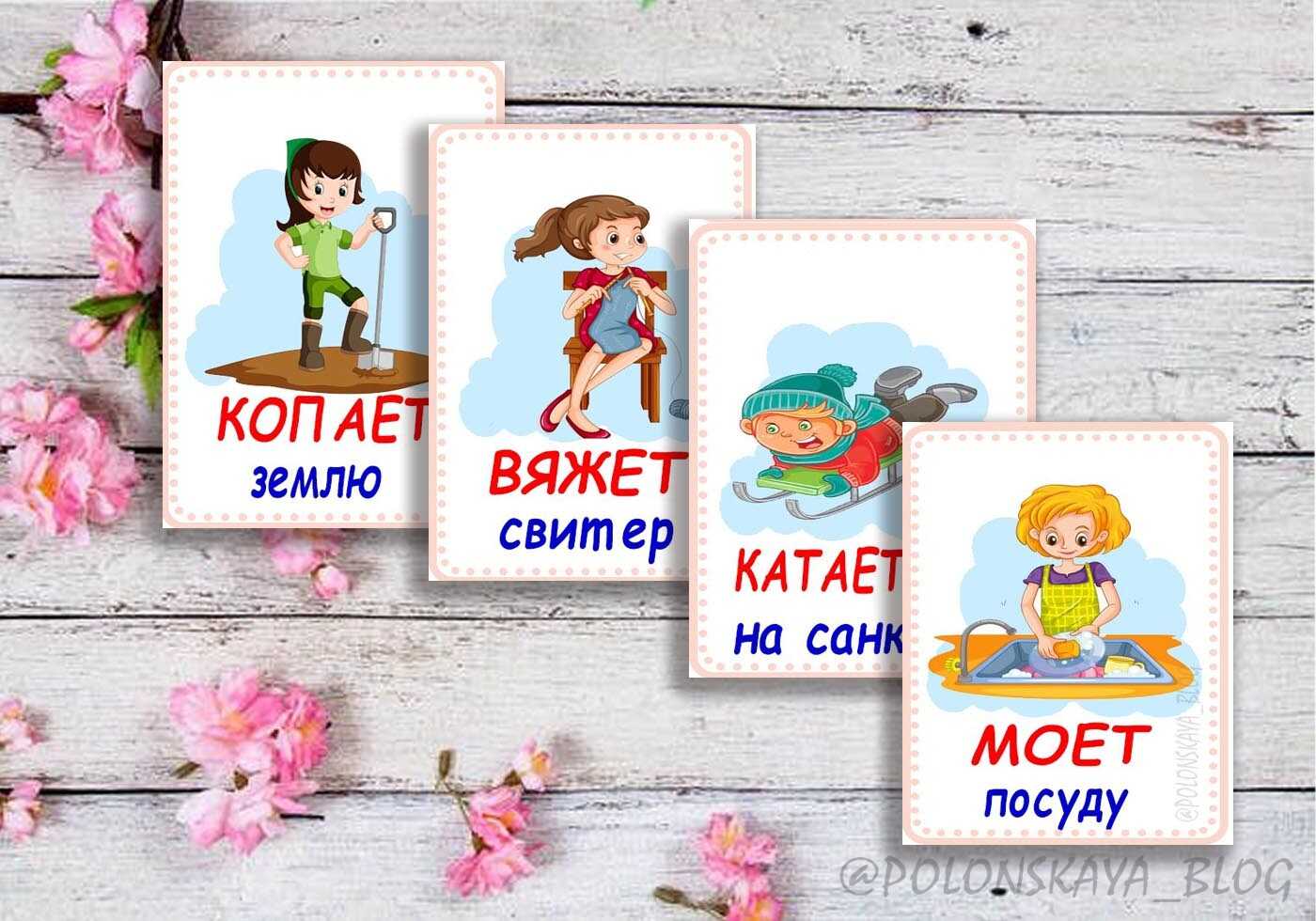 Уровень 3: Включаю в занятия с сыном набор карточек с глаголами. Это слова — действия. Рассматриваем картинки и я проговариваю что видим короткими предложениями: мальчик сидит, девочка кушает кашу.
