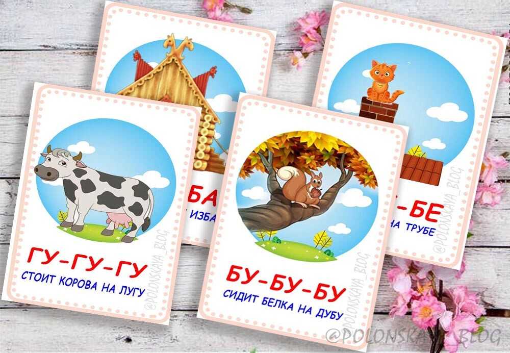 Примерно с 1 год 3 мес, добавляю комплект карточек «Болтушки», в котором каждая карточка — слоговая дорожка-рифмовка с картинкой. Так же показываем картинку ребенку и проговариваем что на ней написано.