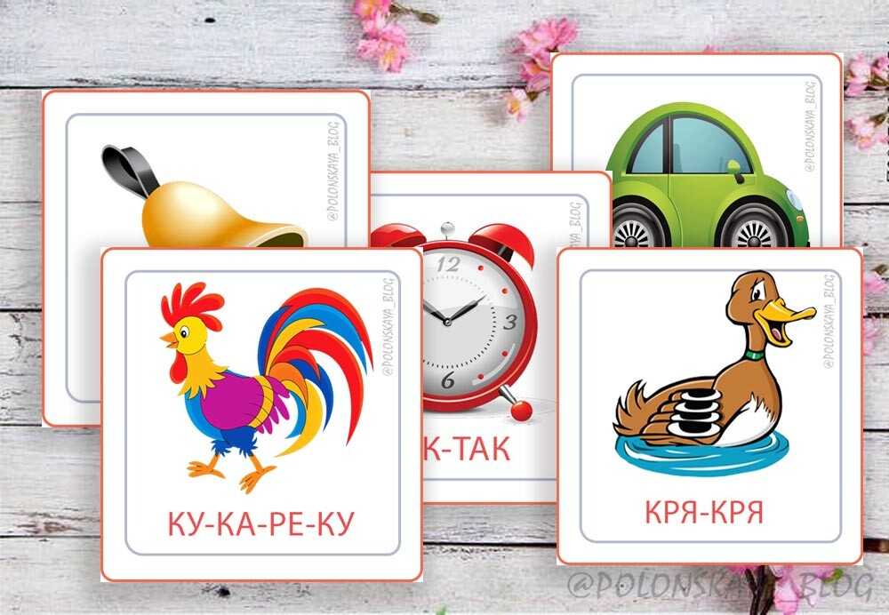 Это карточки, в основном с представителями животного мира, предметы и некоторые глаголы, которые можно озвучить короткими звуками, например, качаться: кач-кач.