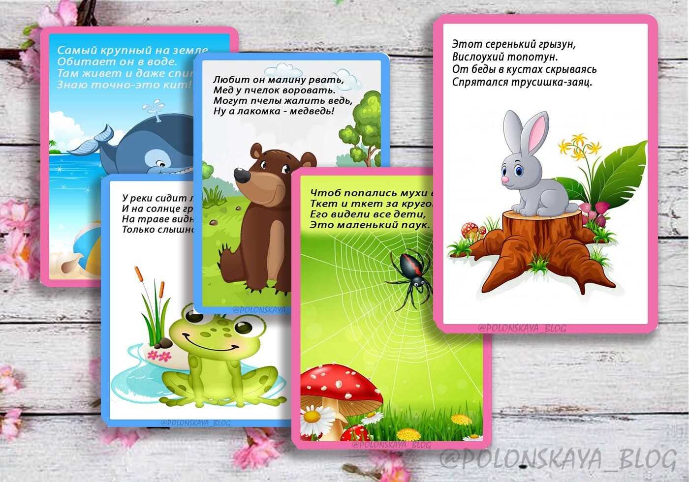 Потом еще усложняю: читаю короткую загадку и выкладываю перед ребенком карточки, он должен озвучить и выбрать правильную карточку — ответ с нужной картинкой.