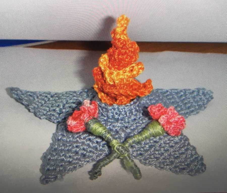 Желтую деталь приклеиваем или пришиваем к картону, сверху фиксируем фиолетовую полосу.