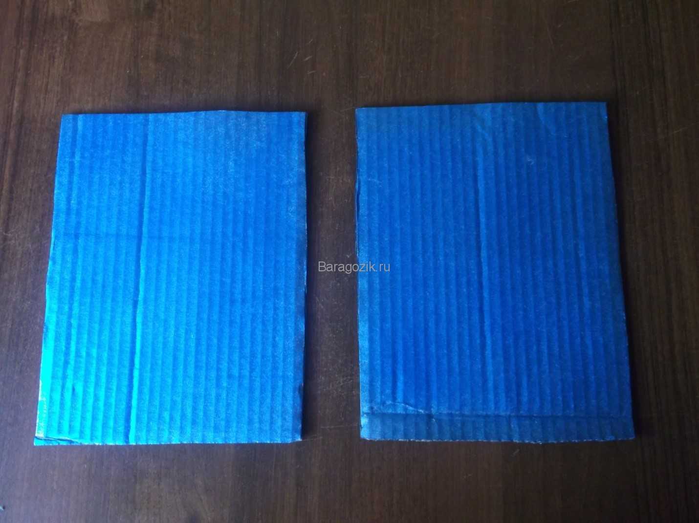 Для начала из гофрированного картона делаем 2 детали размером 22 см * 31 см (верхняя и нижняя часть портфеля) и одну – размером 21 см * 30 см (центральная, открывающаяся часть).