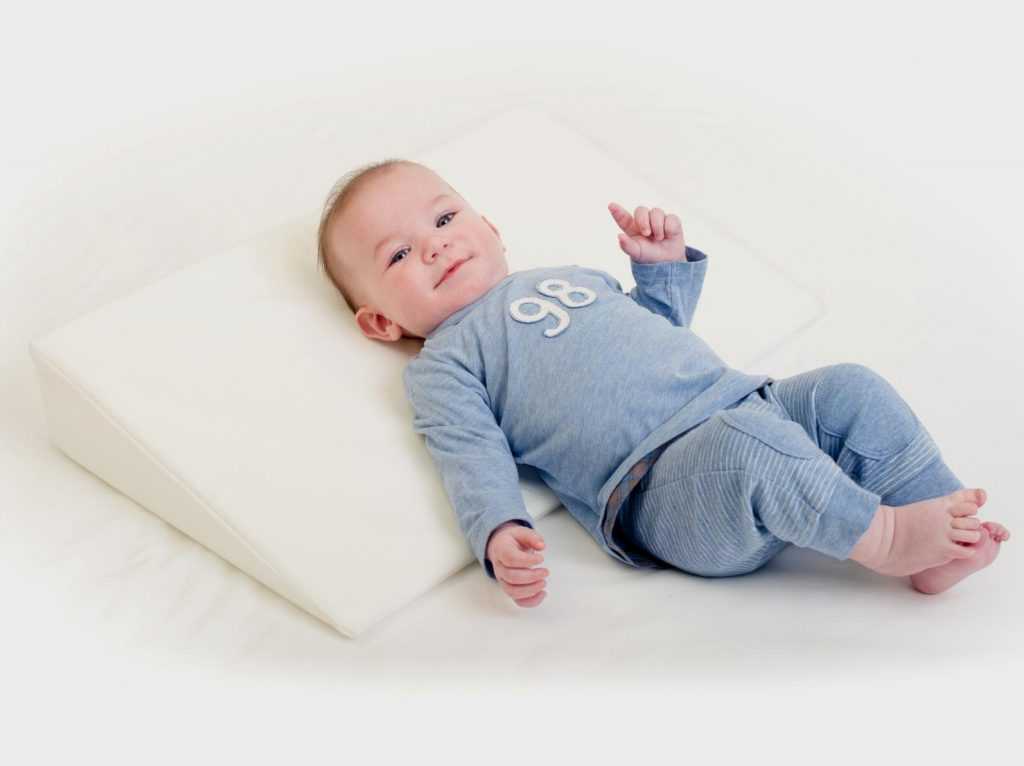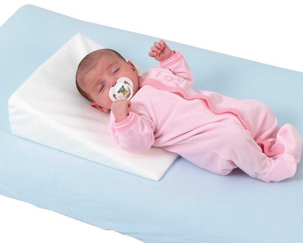 Еще одна ситуация, когда новорожденного можно класть на подушку, только определенной формы. Такие дети подвержены риску аспирации рвотных масс, поэтому для них создана специальная подушка, которая в поперечном срезе имеет форму треугольника и обеспечивает приподнятое положение верхней части тела с углом наклона 15-30⁰
