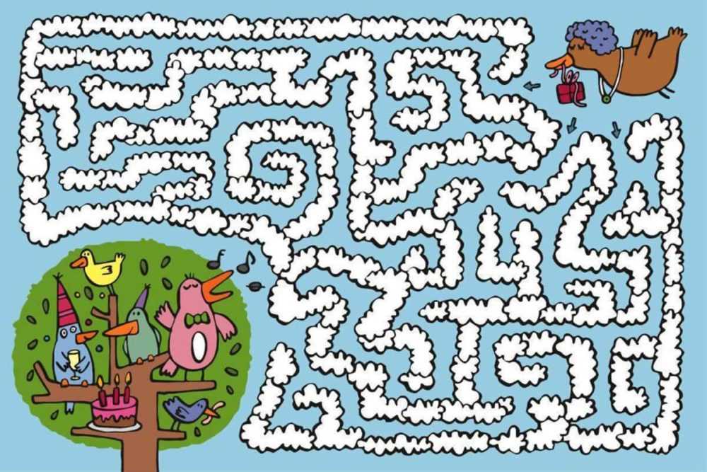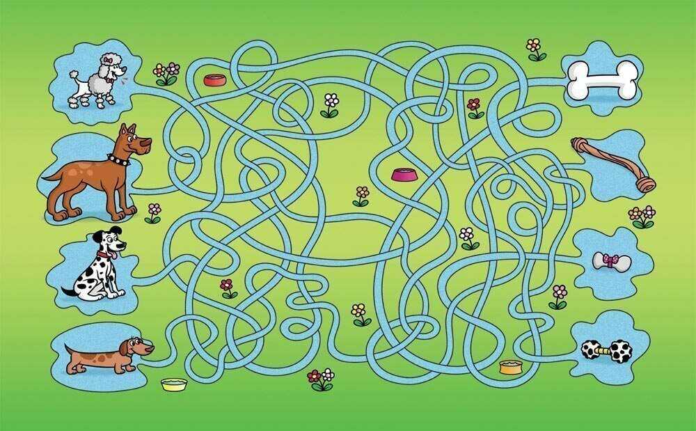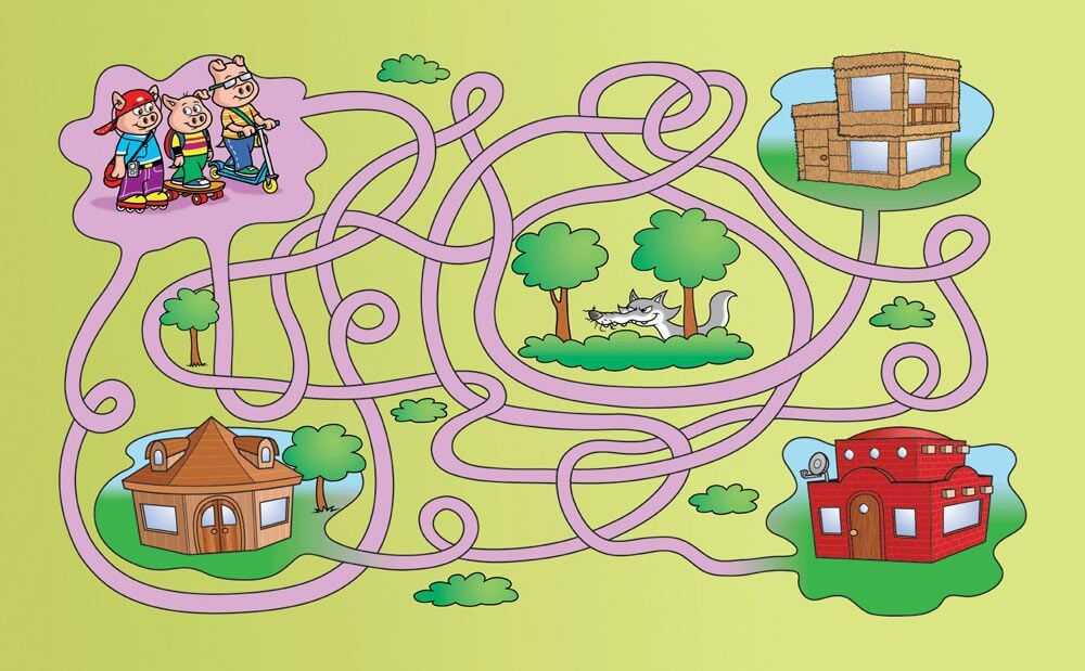 Для совсем маленьких ребятишек обычно используются задачки попроще. Чаще всего рисунок на такой карточке представляет собой достаточно большой лабиринт с широкими «проходами», большим количеством поворотов и тупиков. Чтобы малышу было интереснее, тут же присутствуют какие-либо забавные персонажи. Прохождение такого лабиринта не утомит малыша. А чтобы маленькому человечку было проще, на данном этапе не стоит заставлять его проводить свой путь карандашом. Пусть он сначала найдет правильную дорожку пальчиком, а затем раскрасит её и персонажей цветными карандашами.