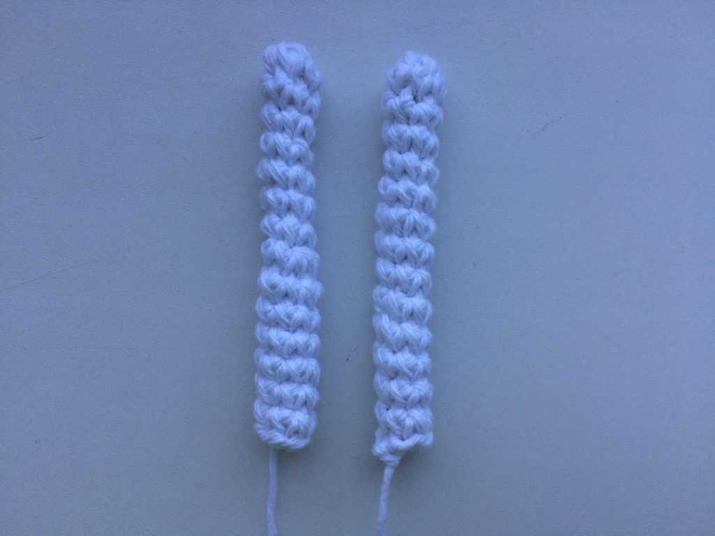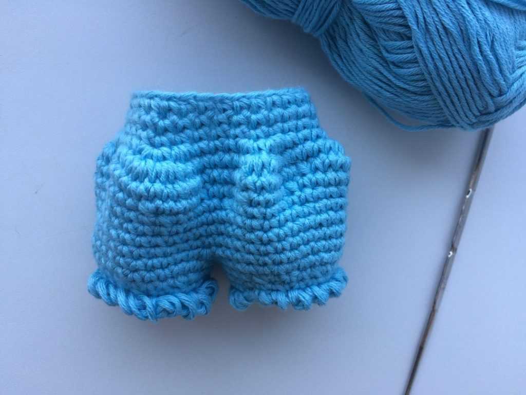 Теперь пользуюсь тем же приемом, что и при вязании ножек. Так же делю шортики пополам и начинаю вязать одну штанину, затем вторую.