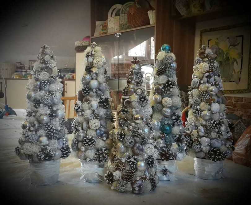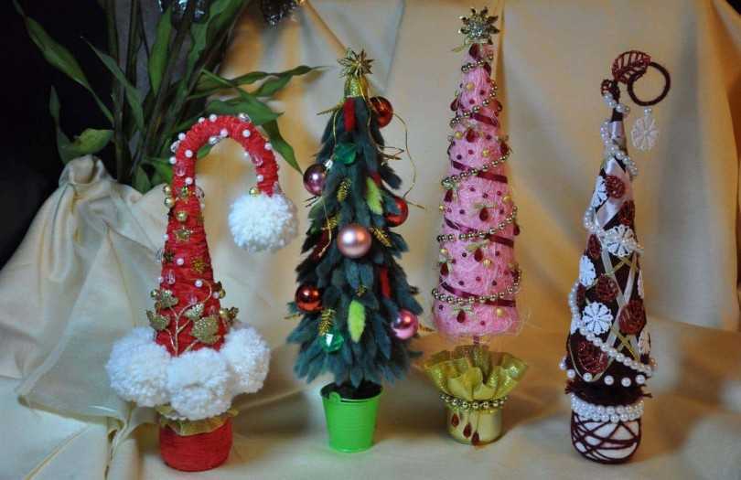 Тубы от туалетной бумаги, пластиковые или бумажные стаканы также выступают подходящим материалом для создания праздничной хвойной гостьи. Для этого требуется склеить около 10-12 стаканчиков или втулок, после чего оформить их шишками, колокольчиками или гирляндами. Необычное новогоднее украшение для группы готово!