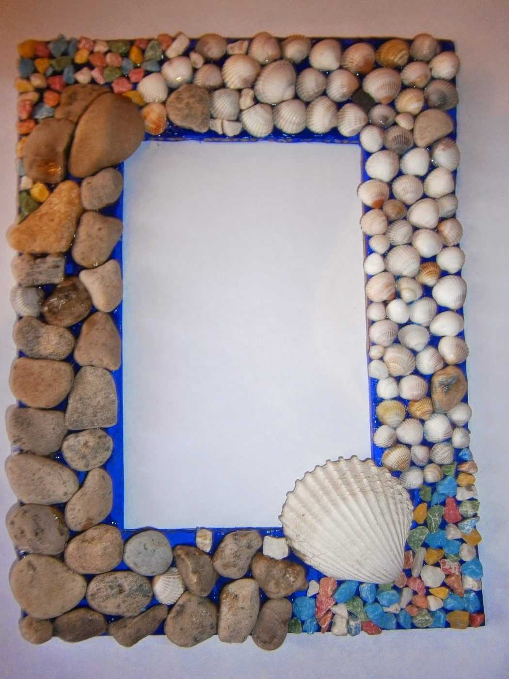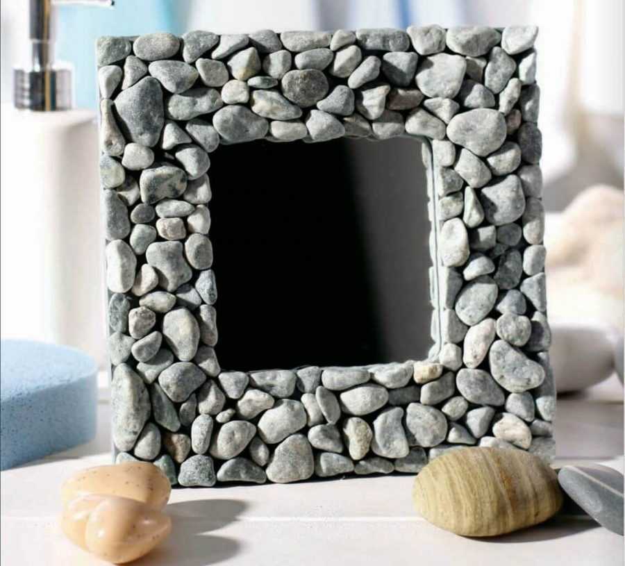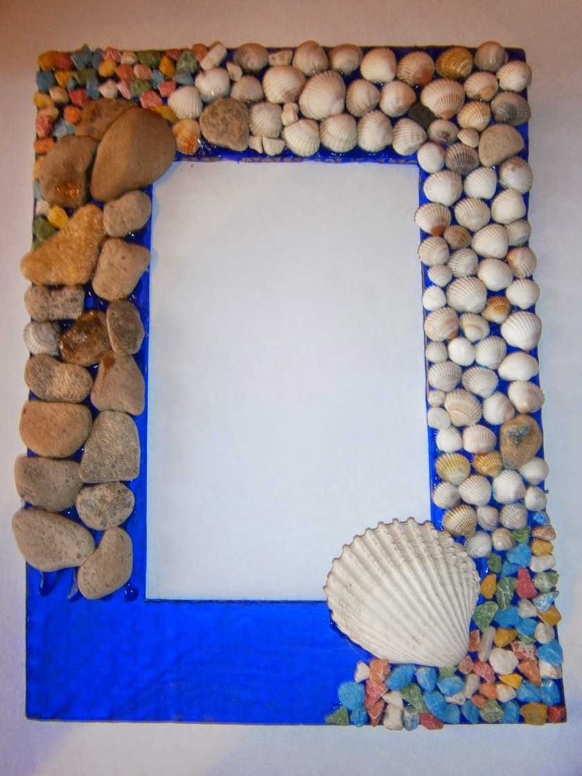 Есть одно правило, соблюдая которое вы сделаете аккуратную рамку, не уступающую по своему виду покупной. Перед началом работы рассортируйте камни по размеру. На основу для рамки в первую очередь нужно наклеить все крупные камни, потом распределить средние, а оставшиеся пустоты заполнить мелкой галькой, песком и дополнительными аксессуарами.