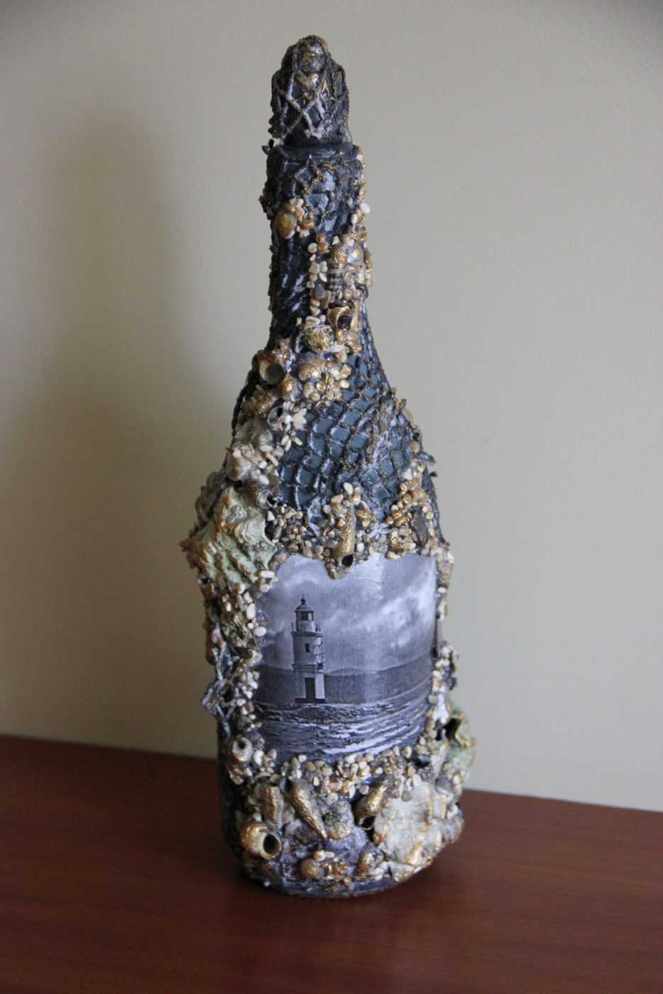 Бутылку можно всю оклеить камнями, а можно приклеить на нее красивую картинку, например с красивым морским видом, а камни расположить вокруг.