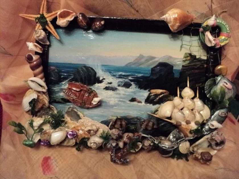 Совет: не используйте в одной картине слишком много разных декоративных деталей. Полотно будет выглядеть как нагромождение разных элементов без четкого рисунка. Достаточно одного, двух акцентов, чтобы картина ожила и завораживала взгляд. Поделки из ракушек своими руками выглядят оригинально, свежо и экзотично.