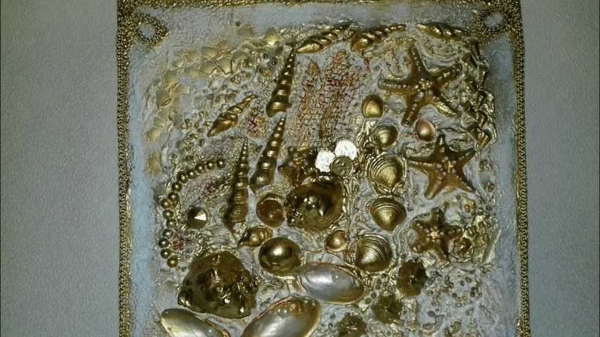 Художественно и красочно из раковин на дощечке создается дно моря с традиционными морскими животными и другими обитателями моря, главным образом рыбами. Материалами для поделки служат не только раковины, но и морская галька и стеклянные детали.