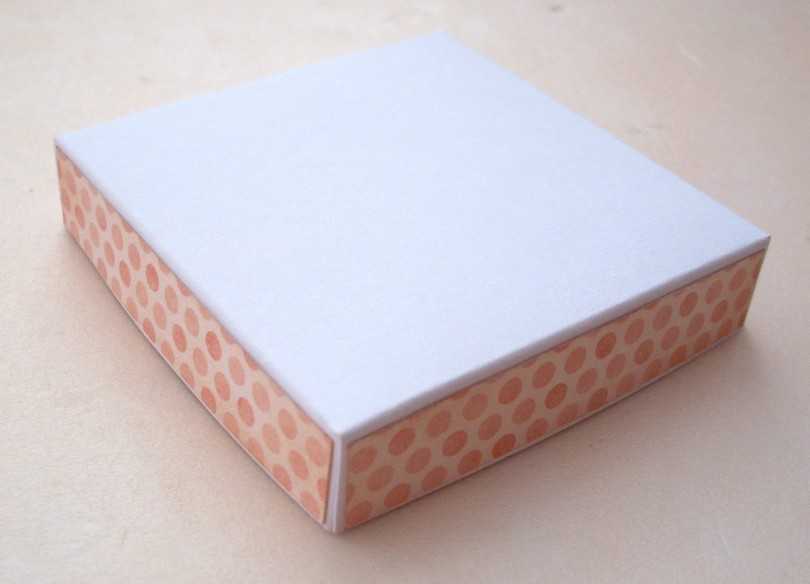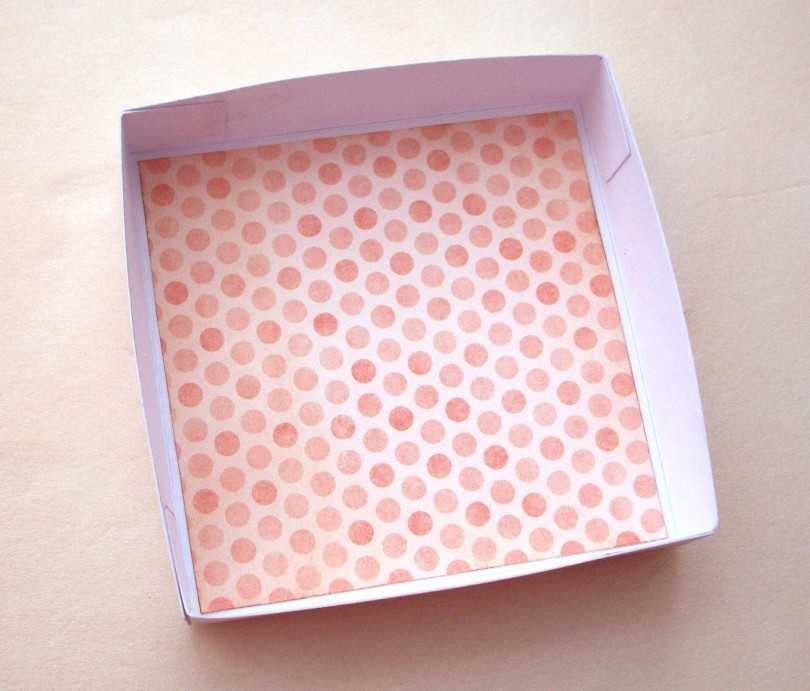 После оформления внутренние части коробки необходимо сделать крышку. Для этого потребуется вырезать из плотной бумаги, а лучше из листа ватмана, квадрат, каждая сторона которого составляет 11 см. Внутри расчертить квадратную фигуру основы, составляющей 9 см. С каждой стороны на полях сделать разрезы по 2 см. Затем зафиксировать угловые разрезы крышки, а сверху наклеить оставшийся декоративный лист квадрата скрап-бумаги.