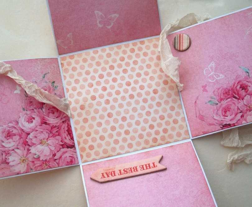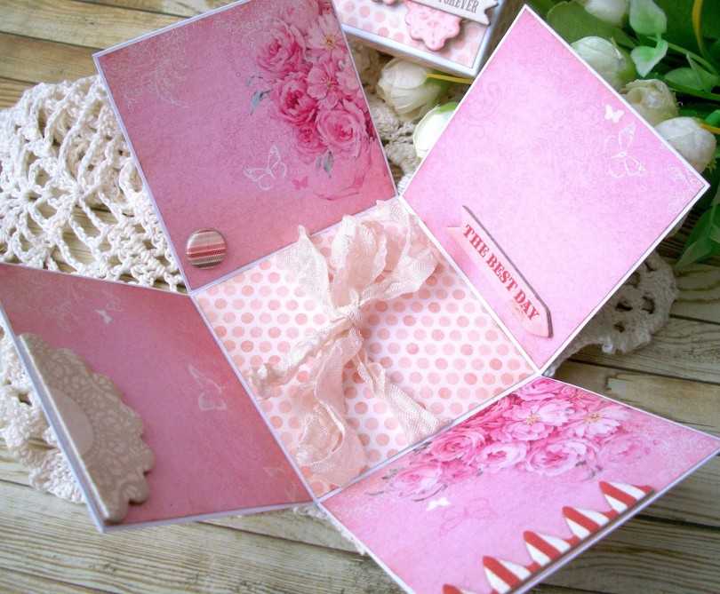 Составляя оригинальную коробочку, можно применить более сложную конструкцию. Так, при снятии крышки основа будет раскладываться на 4 основные части, а каждая отдельно сторона раскрываться на несколько дополнительных отделов. А в каждом отделе можно расположить картинки с пожеланиями, записки и любые миниатюрные предметы.