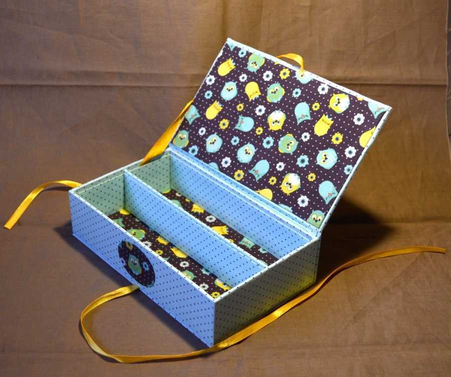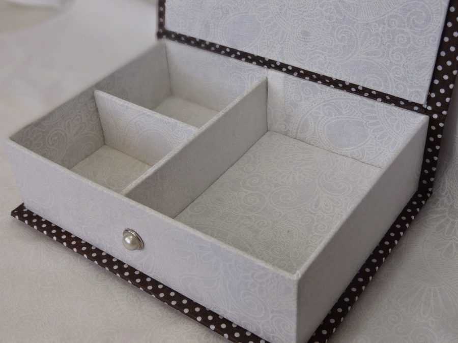 Внутреннюю часть можно разделить на секции, используя полоски из плотного картона, обклеенного красивой бумагой. Такое изделие удобно использовать для хранения украшений, косметики, ниток с иголками, материалов для творчества и других мелочей.