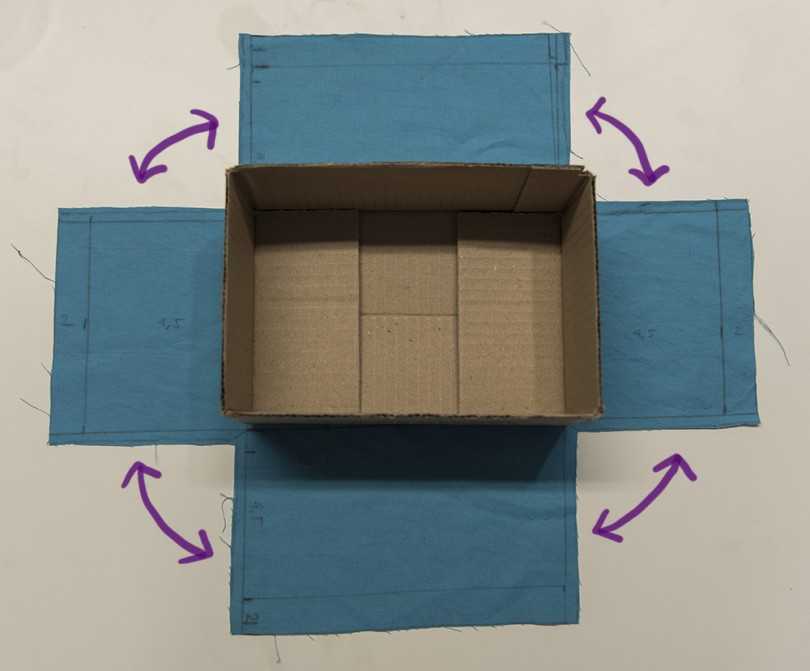 Изготавливается коробка из картона. Потребуется взять 5 одинаковых гофрированных листов. Они выкладываются на поверхности стола следующим образом: один лист по центру и другие сбоку. Между ними должны оставаться небольшие промежутки.