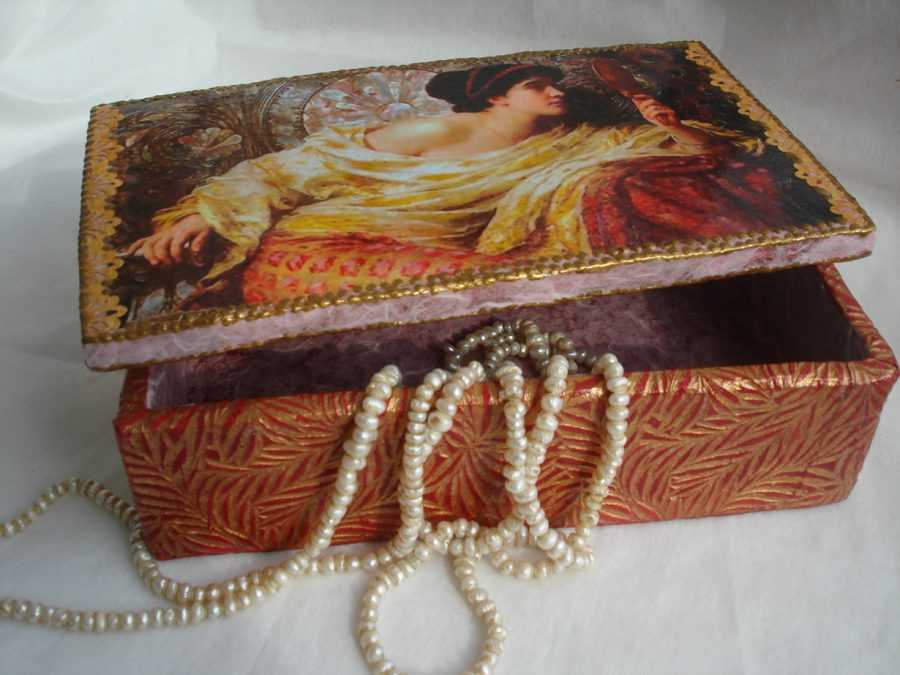 Можно пойти дальше и добавить стразы, пайетки или блёстки. Вариантов очень много. Ниже приведены фото шкатулок для украшений подобного плана.
