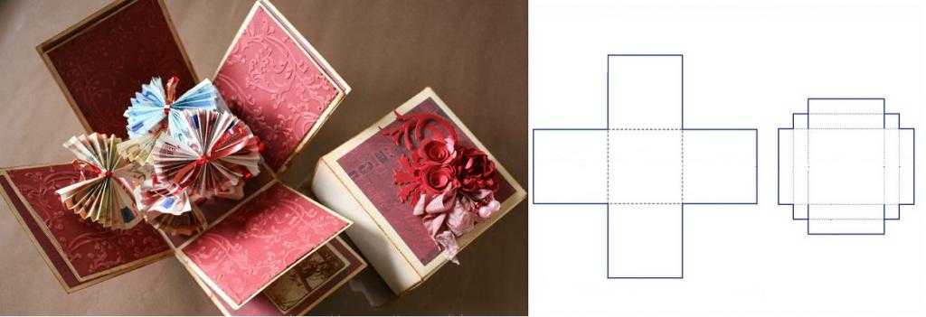 Это одна из самых чудесных идей для оформления подарка. Коробочка раскрывается сама, стоит только поднять крышку. На дне закреплен какой-нибудь небольшой сюрприз: пирожное, свернутая денежная купюра, украшение или декоративная композиция.