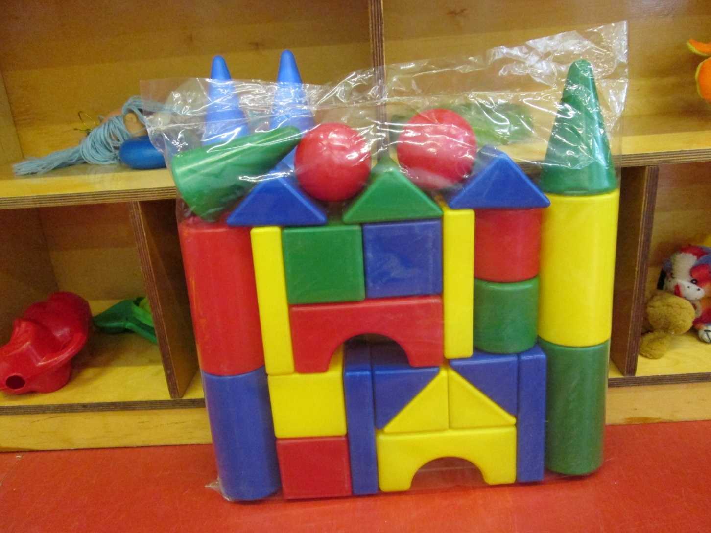 - Различает несколько геометрических форм: шары, кубики, кирпичики.