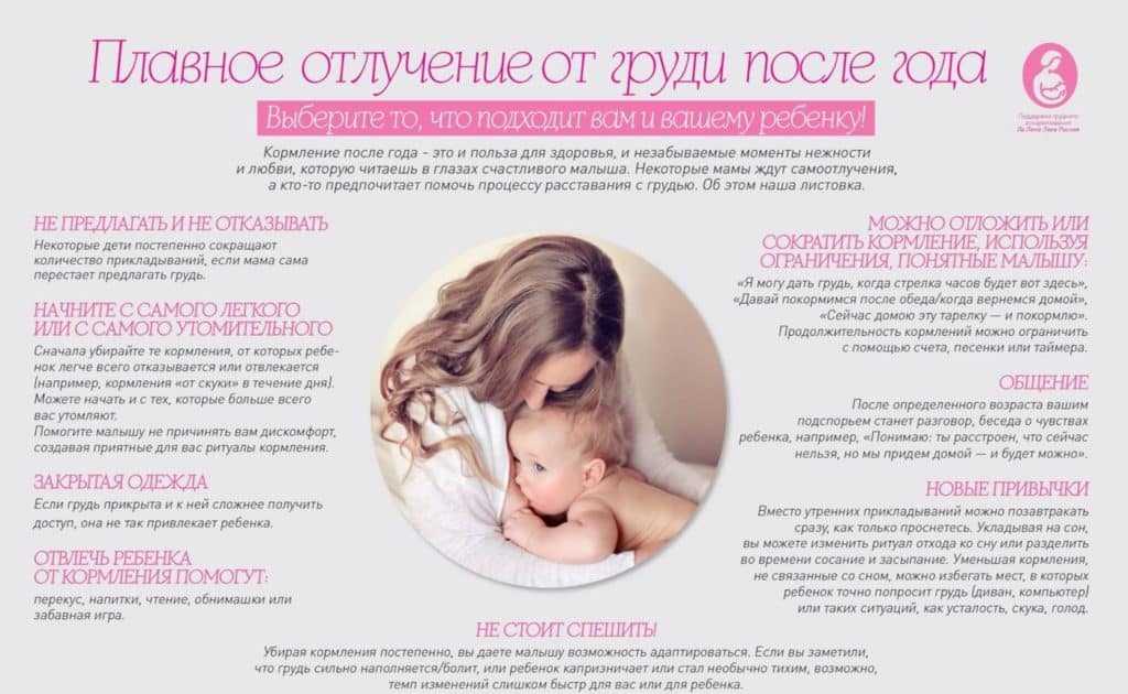 Поэтому в случае завершения лактации по достижении малышом возраста 1,5-2 лет речь идет о гораздо большем, чем просто отбирание молока. К этому периоду пищевая потребность в груди равна практически нулю и самые частые поводы просить ее — расстройства, болезненные ощущения и необходимость заснуть